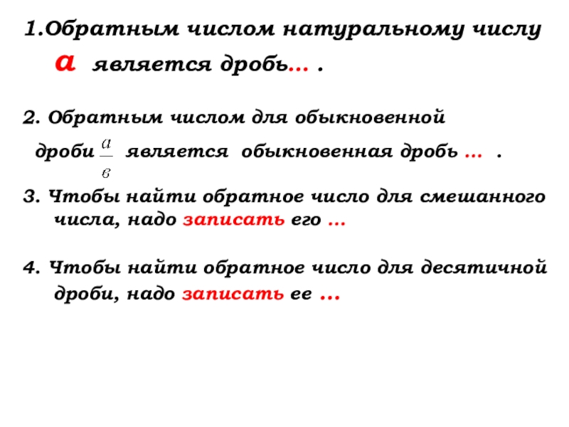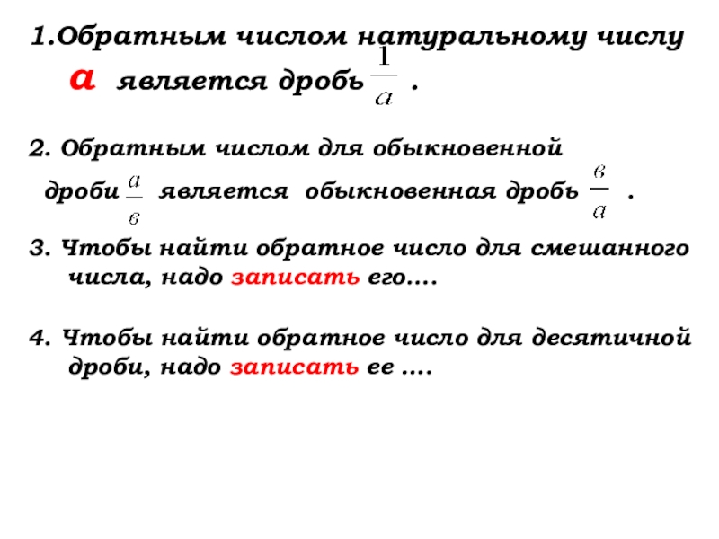 Слайд 411.Обратным числом натуральному числу а является дробь .
