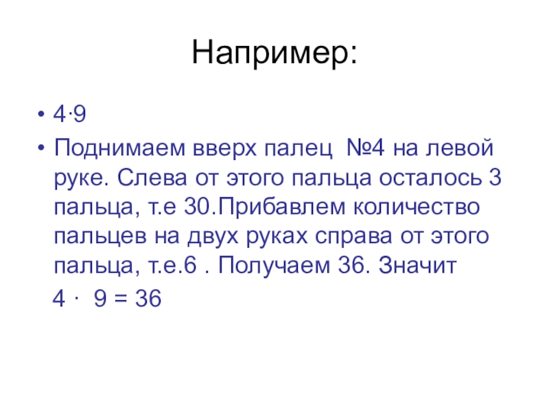 Положите обе руки рядом на стол. По порядку занумеруем пальцы рук следующим образом: первый палец слева обозначим 1, второй за ним – 2, затем 3,4… до десятого пальца. Если надо умножить на 9 любое из первых девяти чисел, то для этого, не двигая рук со стола, надо приподнять тот палец, номер которого означает число, на которое умножается девять; тогда число пальцев, лежащих налево от поднятого пальца, определяет число десятков, а число пальцев, лежащих справа от поднятого пальца, обозначает число единиц полученного произведения.