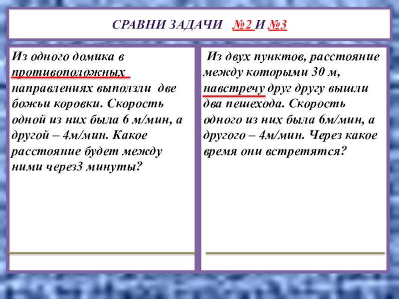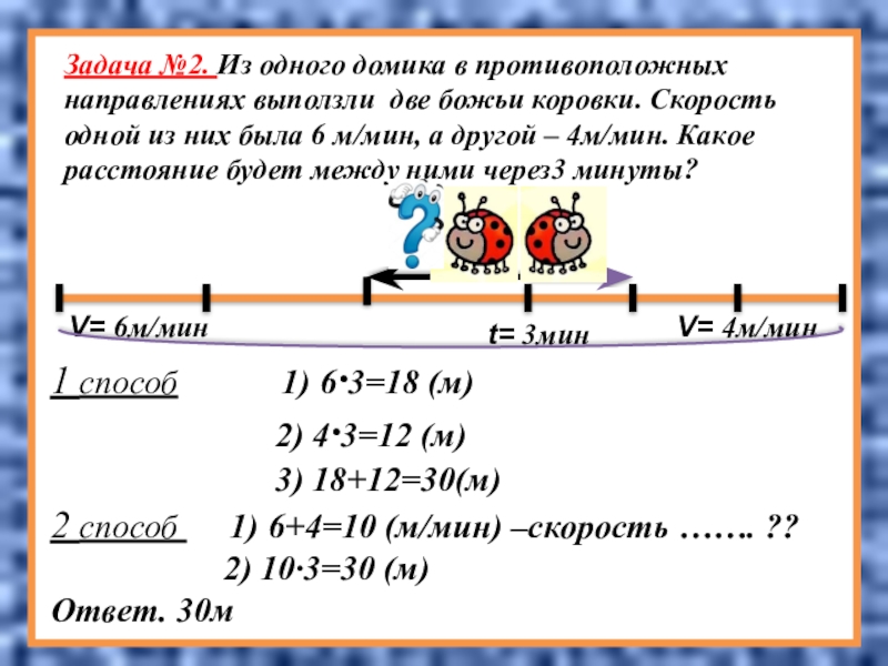 Задача №2. Из одного домика в противоположных направлениях выползли две божьи коровки. Скорость одной из них была 6 м/мин, а другой – 4м/мин. Какое расстояние будет между ними через3 минуты?