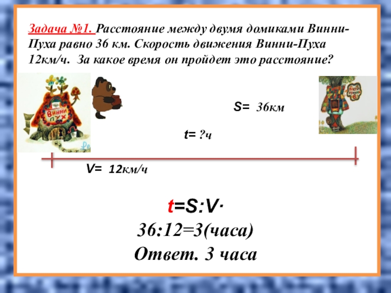 Задача №1. Расстояние между двумя домиками Винни-Пуха равно 36 км. Скорость движения Винни-Пуха 12км/ч. За какое время он пройдет это расстояние?