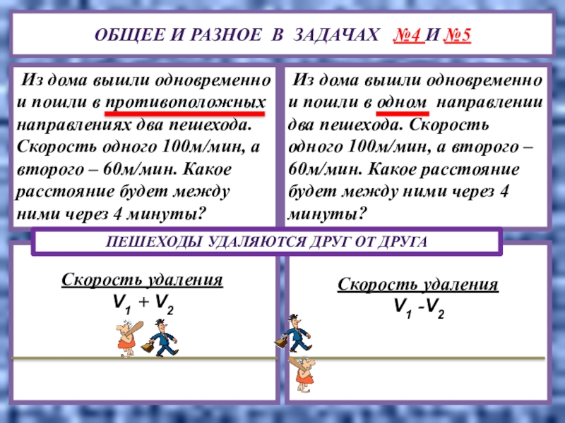 Из дома вышли одновременно и пошли в одном направлении два пешехода. Скорость одного 100м/мин, а второго – 60м/мин. Какое расстояние будет между ними через 4 минуты?
