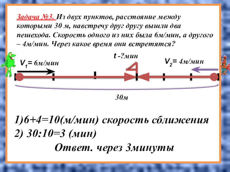 Задача №3. Из двух пунктов, расстояние между которыми 30 м, навстречу друг другу вышли два пешехода. Скорость одного из них была 6м/мин, а другого – 4м/мин. Через какое время они встретятся?