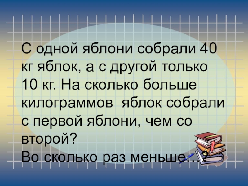 С одной яблони собрали 40 кг яблок, а с другой только 10 кг. На сколько больше килограммов яблок собрали с первой яблони, чем со второй? Во сколько раз меньше…?