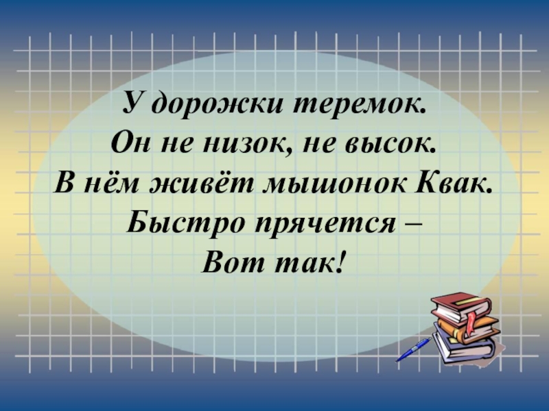 У дорожки теремок. Он не низок, не высок. В нём живёт мышонок Квак. Быстро прячется –