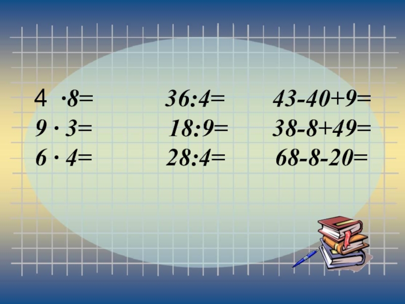 4 ·8=   36:4=  43-40+9= 9 · 3=      18:9=