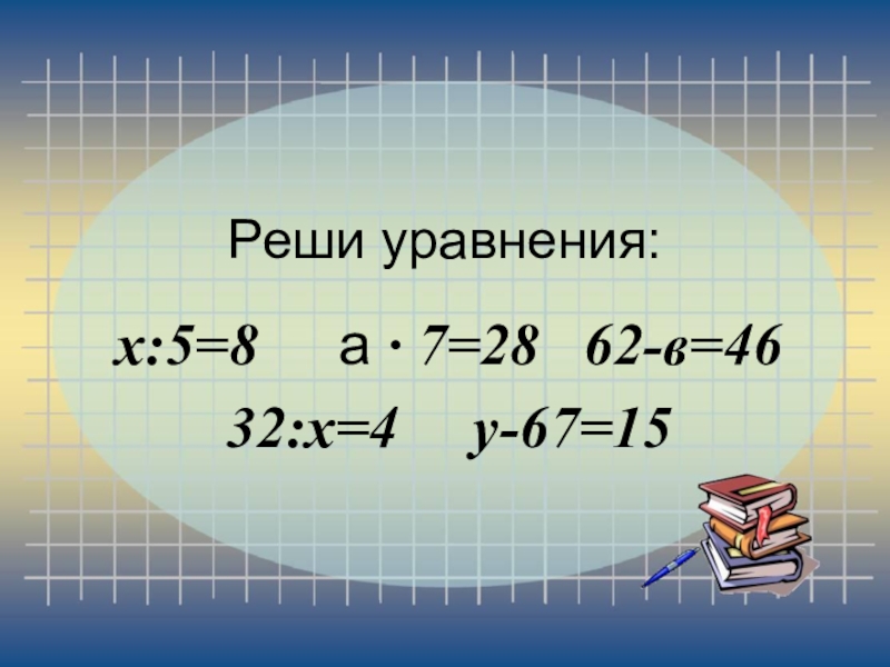 Реши уравнения:х:5=8   а · 7=28  62-в=4632:х=4   у-67=15