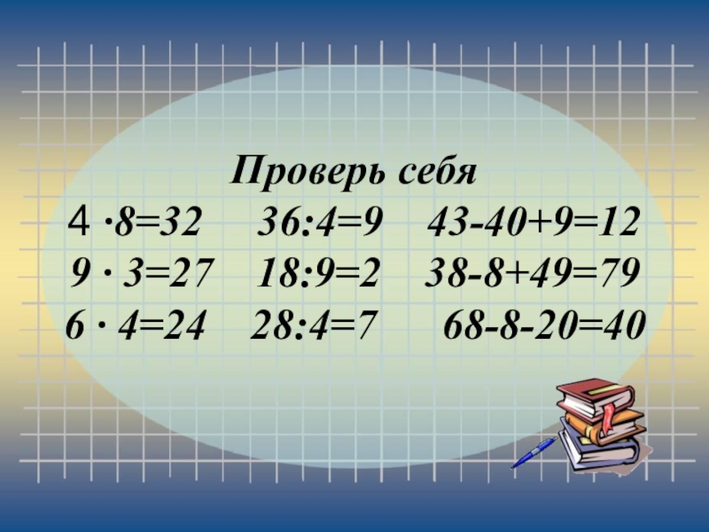 Слайд 6Проверь себя 4 ·8=32 36:4=9 43-40+9=12 9 · 3=27