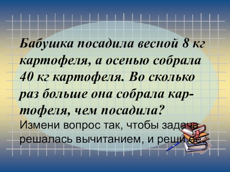 картофеля. Во сколько раз больше она собрала кар-тофеля, чем посадила? Измени вопрос так, чтобы задача решалась вычитанием, и реши её.