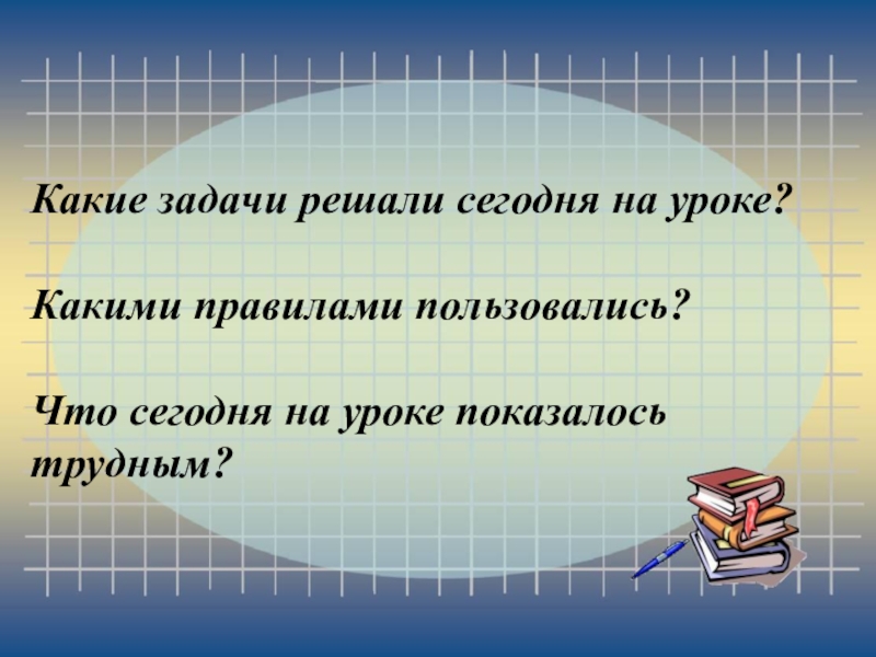 Какие задачи решали сегодня на уроке?  Какими правилами пользовались?  Что сегодня на уроке показалось трудным?