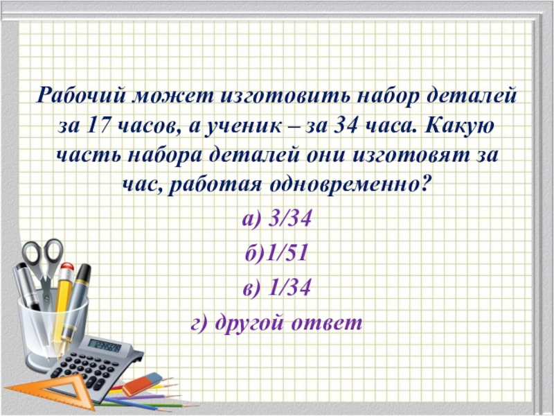 Рабочий может изготовить набор деталей за 17 часов, а ученик – за 34 часа. Какую часть набора
