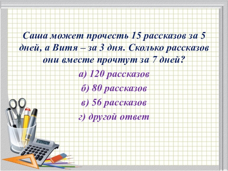 Саша может прочесть 15 рассказов за 5 дней, а Витя – за 3 дня. Сколько рассказов они