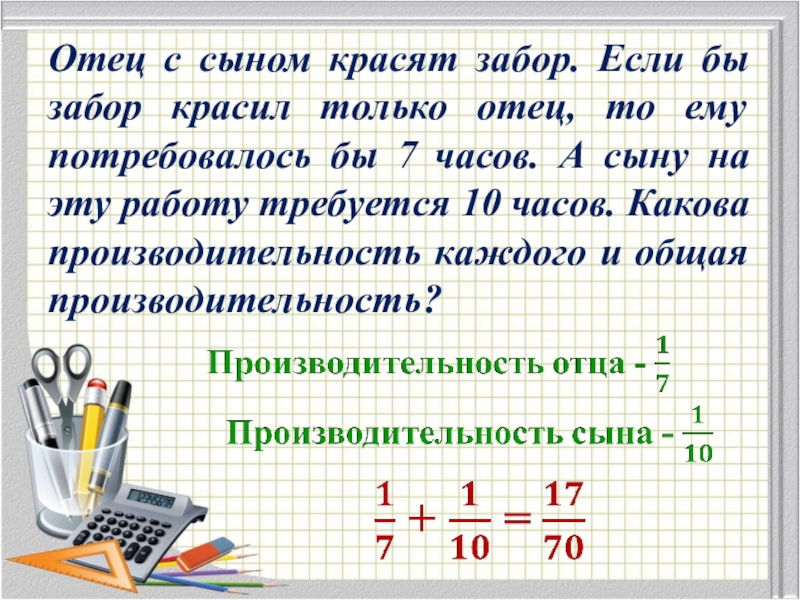 то ему потребовалось бы 7 часов. А сыну на эту работу требуется 10 часов. Какова производительность каждого и общая производительность?