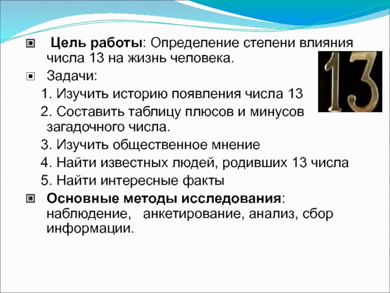 Цель работы: Определение степени влияния числа 13 на жизнь человека.