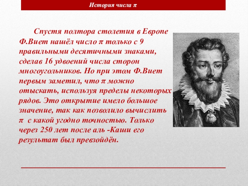 Значение 3 1/7 до сих пор считается вполне хорошим приближением числа π для прикладных задач. Более точное приближение 3 17/120 (π =3,14166) нашёл знаменитый астроном, создатель тригонометрии Клавдий Птолемей (2 в.), но оно не вошло в употребление.