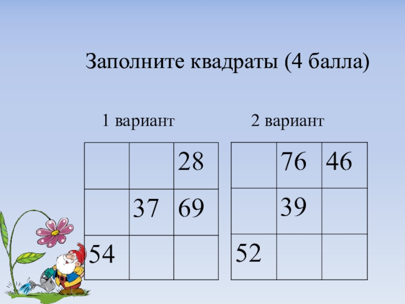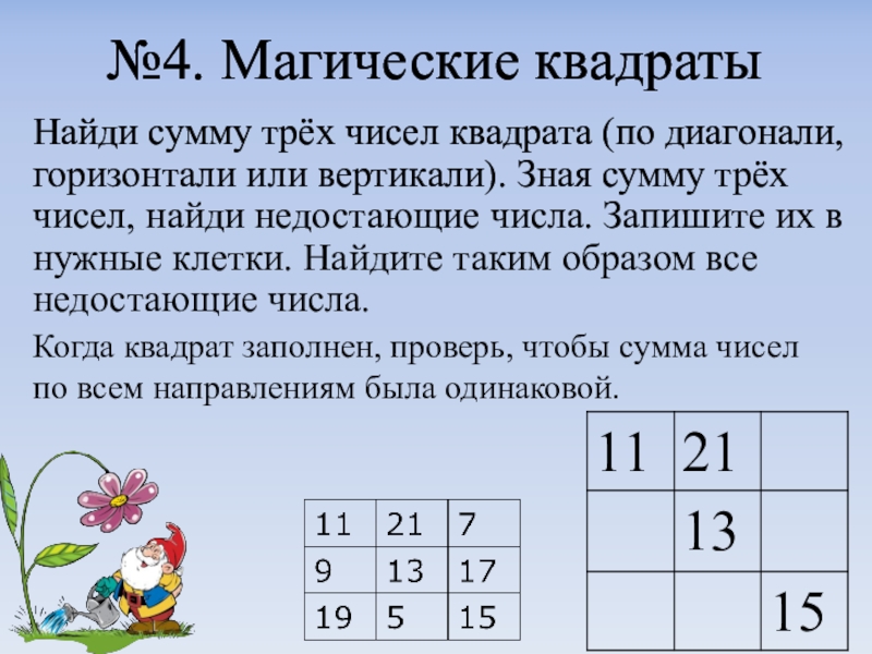 Когда квадрат заполнен, проверь, чтобы сумма чисел по всем направлениям была одинаковой.