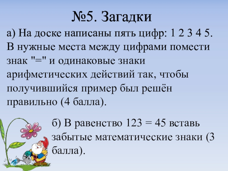 б) В равенство 123 = 45 вставь забытые математические знаки (3 балла).