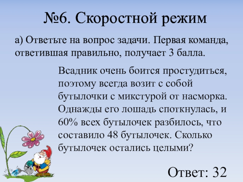 Всадник очень боится простудиться, поэтому всегда возит с собой бутылочки с микстурой от насморка. Однажды его лошадь споткнулась, и 60% всех бутылочек разбилось, что составило 48 бутылочек. Сколько бутылочек остались целыми?