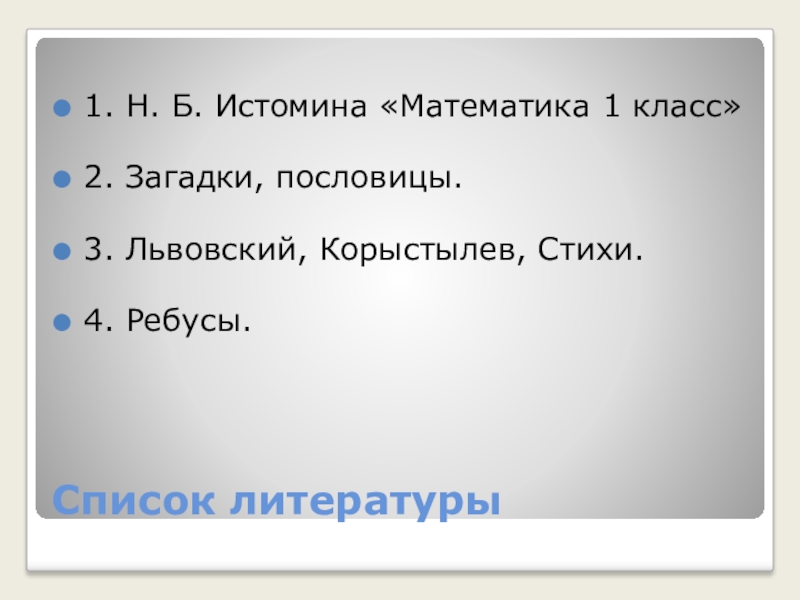 Список литературы1. Н. Б. Истомина «Математика 1 класс»2. Загадки, пословицы.3. Львовский, Корыстылев, Стихи.4. Ребусы.