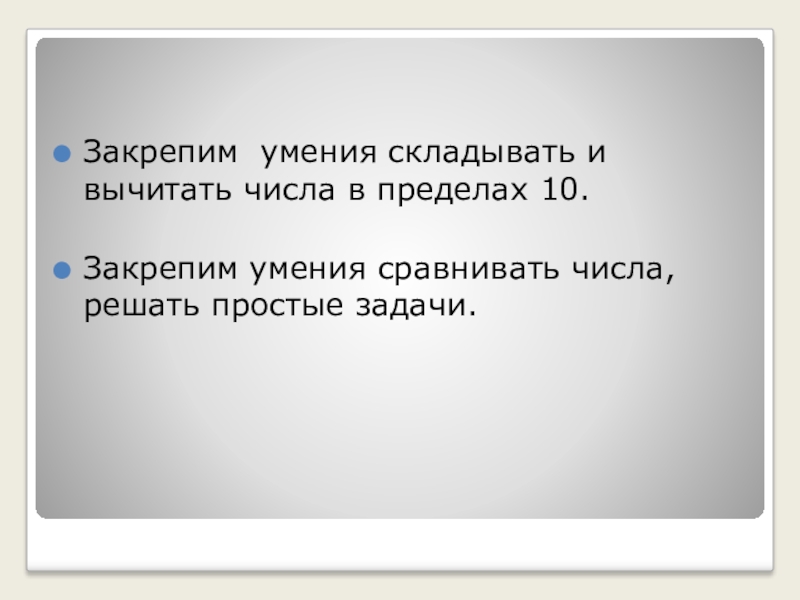 Закрепим умения складывать и вычитать числа в пределах 10.Закрепим умения сравнивать числа, решать простые задачи.