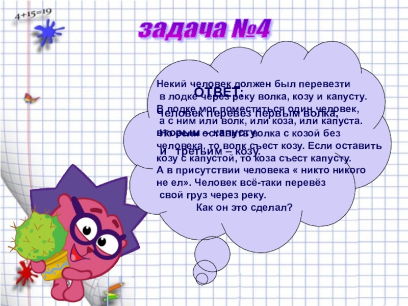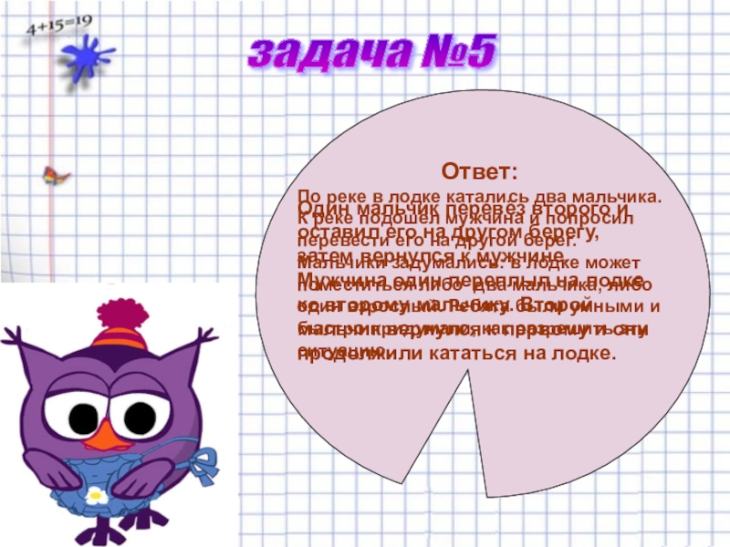 Один мальчик перевёз второго и оставил его на другом берегу, затем вернулся к мужчине. Мужчина один переплыл на лодке ко второму мальчику. Второй мальчик вернулся к первому и они продолжили кататься на лодке.