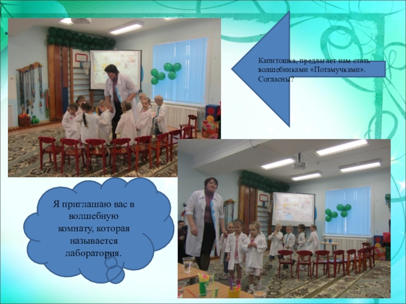 Я приглашаю вас в волшебную комнату, которая называется лаборатория. Капитошка, предлагает нам стать волшебниками «Потамучками».