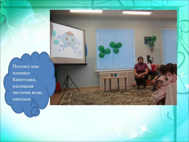 Слайд 9Поэтому нам поможет Капитошка, маленькая частичка воды, капелька.