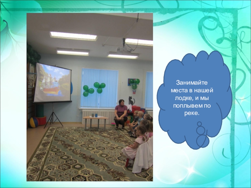 Слайд 11Занимайте места в нашей лодке, и мы поплывем по реке.