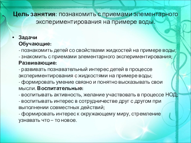 Слайд 3Цель занятия: познакомить с приемами элементарного экспериментирования на примере воды.