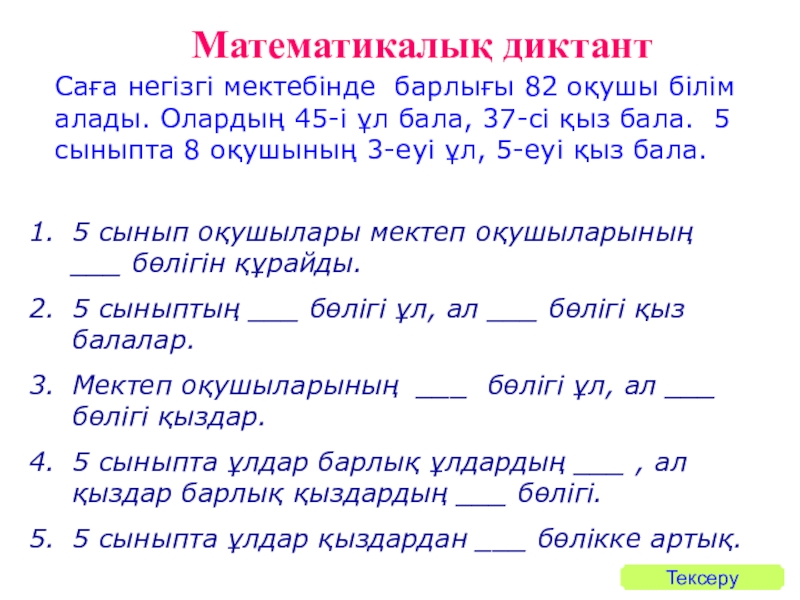 5 сыныпта ұлдар барлық ұлдардың ___ , ал қыздар барлық қыздардың ___ бөлігі.