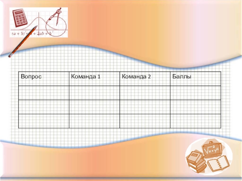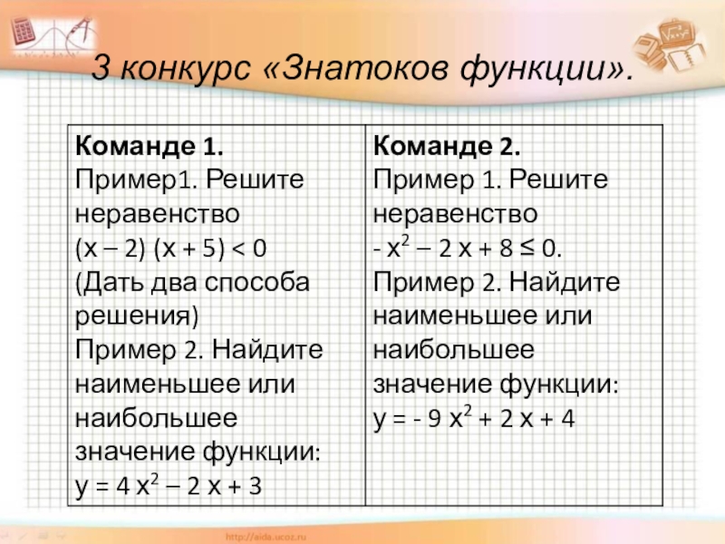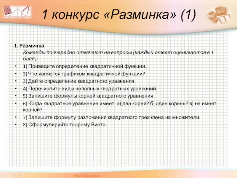 1 конкурс «Разминка» (1) 1. Разминка Команды поочередно отвечают на вопросы (каждый ответ оценивается в 1 балл):1) Приведите определение квадратичной функции.2) Что является графиком квадратичной функции?3) Дайте определение квадратного уравнения.4) Перечислите виды неполных квадратных уравнений.5) Запишите формулы корней квадратного уравнения.6) Когда квадратное