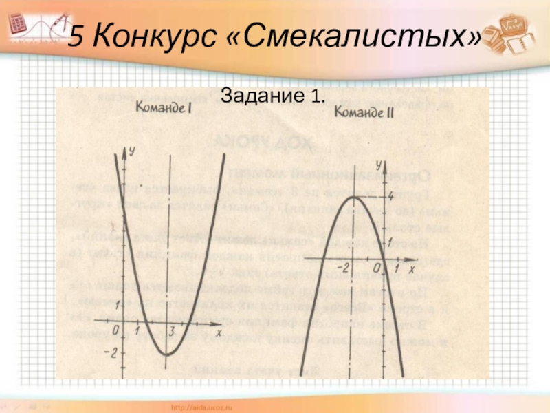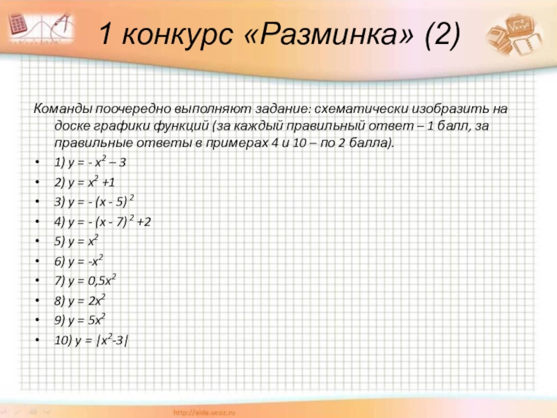 1 конкурс «Разминка» (2)  Команды поочередно выполняют задание: схематически изобразить на доске графики функций (за каждый