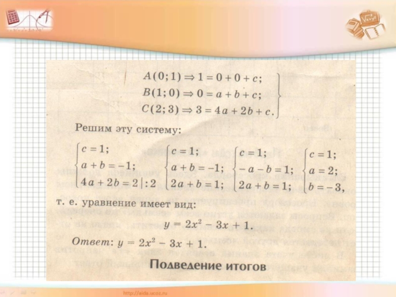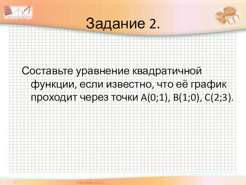 Задание 2.Составьте уравнение квадратичной функции, если известно, что её график проходит через точки A(0;1), B(1;0), C(2;3).