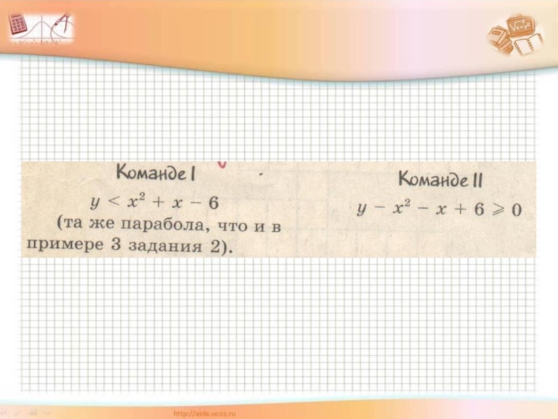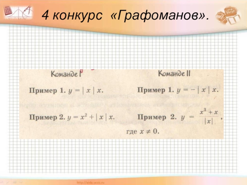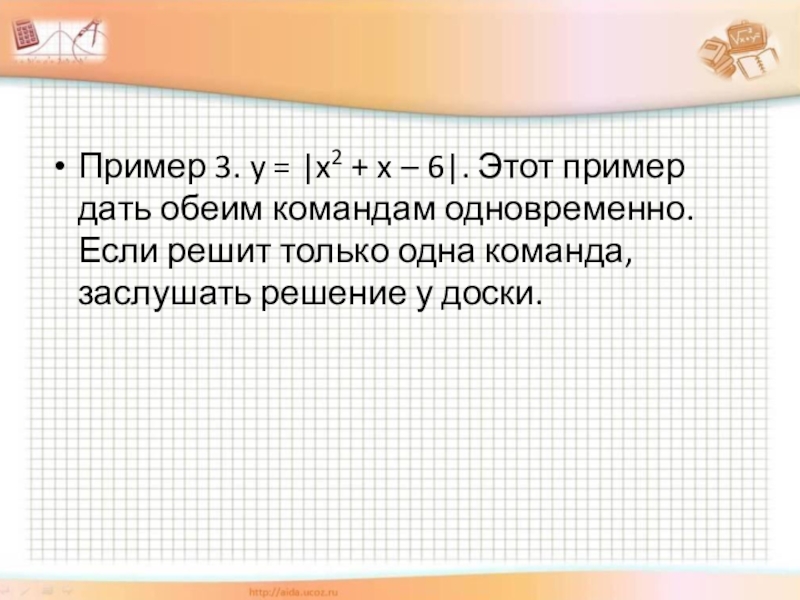 Пример 3. y = |x2 + x – 6|. Этот пример дать обеим командам одновременно. Если решит