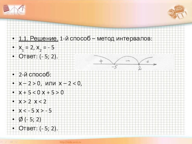 1.1. Решение. 1-й способ – метод интервалов:х1 = 2, х2 = - 5Ответ: (- 5; 2).2-й способ:х – 2 >
