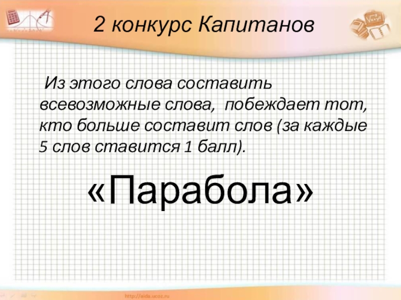 2 конкурс Капитанов  	Из этого слова составить всевозможные слова, побеждает тот, кто больше составит слов