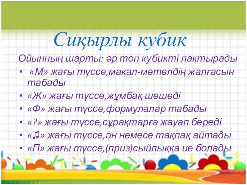 Сиқырлы кубикОйынның шарты: әр топ кубикті лақтырады «М» жағы түссе,мақал-мәтелдің жалғасын табады«Ж»