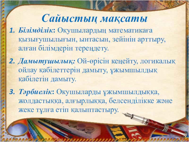 Білімділік: Оқушылардың математикаға қызығушылығын, ынтасын, зейінін арттыру, алған білімдерін тереңдету.