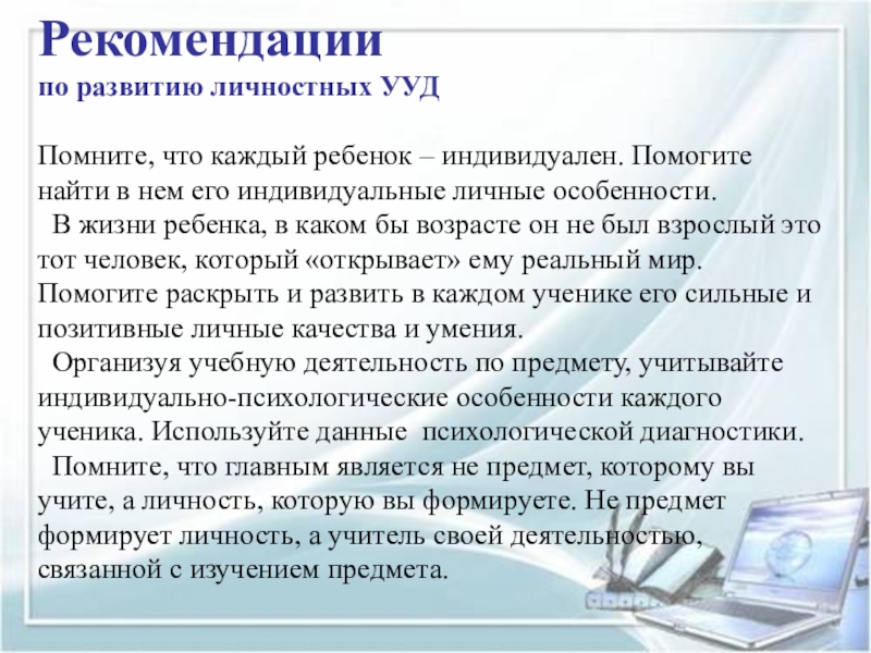 Помните, что главным является не предмет, которому вы учите, а личность, которую вы формируете. Не предмет формирует личность, а учитель своей деятельностью, связанной с изучением предмета.