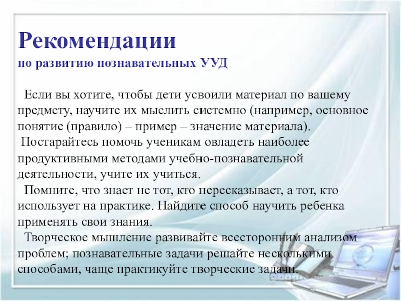 Постарайтесь помочь ученикам овладеть наиболее продуктивными методами учебно-познавательной деятельности, учите их учиться.