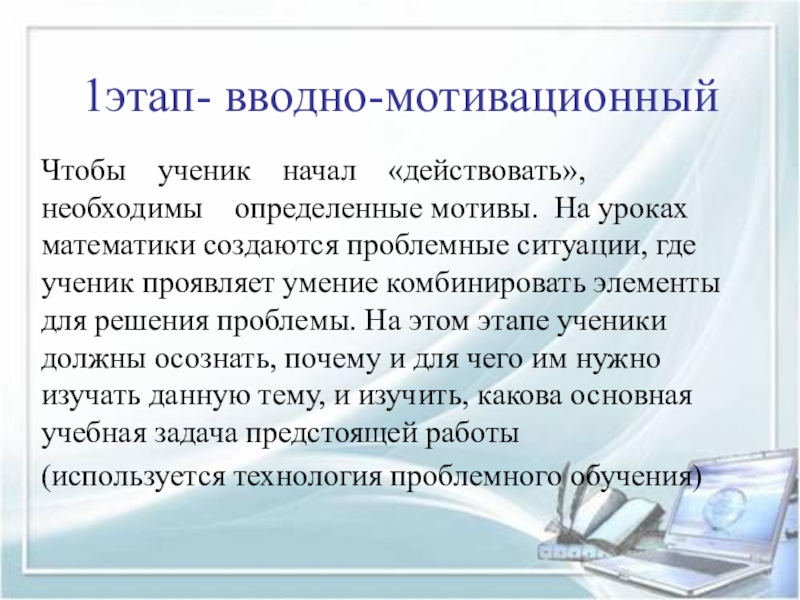 определенные мотивы. На уроках математики создаются проблемные ситуации, где ученик проявляет умение комбинировать элементы для решения проблемы. На этом этапе ученики должны осознать, почему и для чего им нужно изучать данную тему, и изучить, какова основная учебная задача предстоящей работы