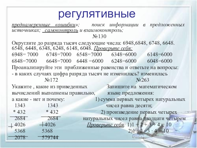 преднамеренные «ошибки»; поиск информации в предложенных источниках; самоконтроль