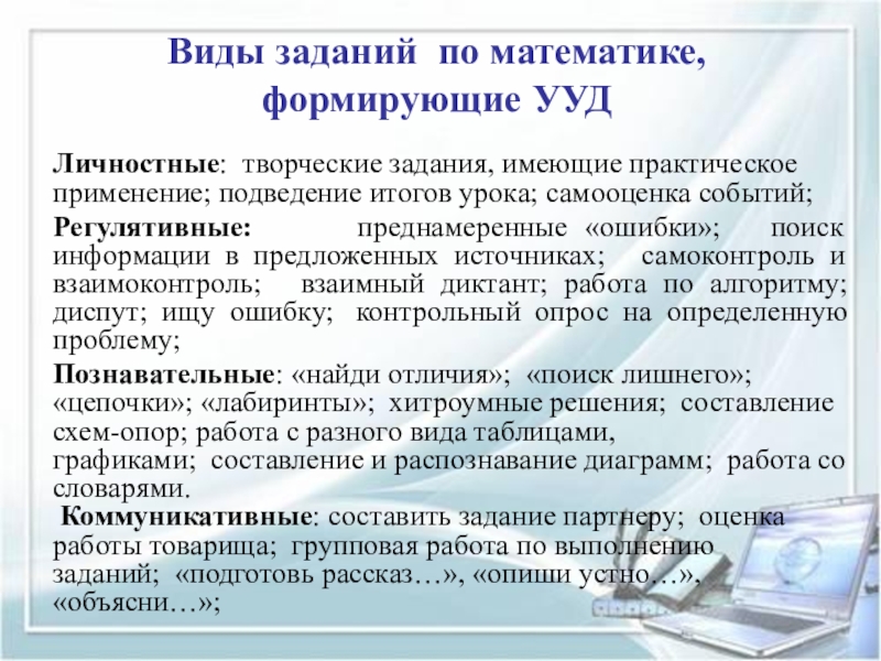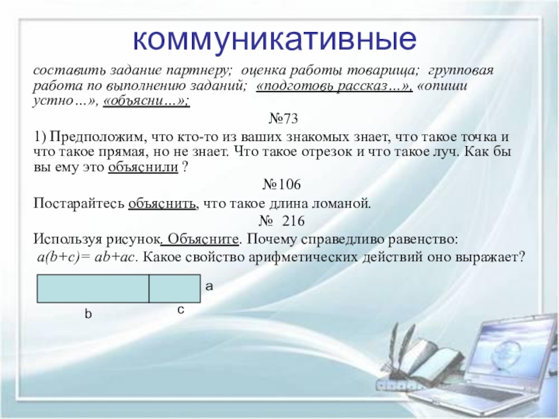 Коммуникативные: составить задание партнеру; оценка работы товарища; групповая работа по выполнению заданий; «подготовь рассказ…», «опиши устно…», «объясни…»;