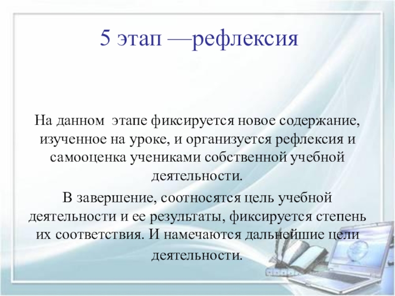 В завершение, соотносятся цель учебной деятельности и ее результаты, фиксируется степень их соответствия. И намечаются дальнейшие цели деятельности.