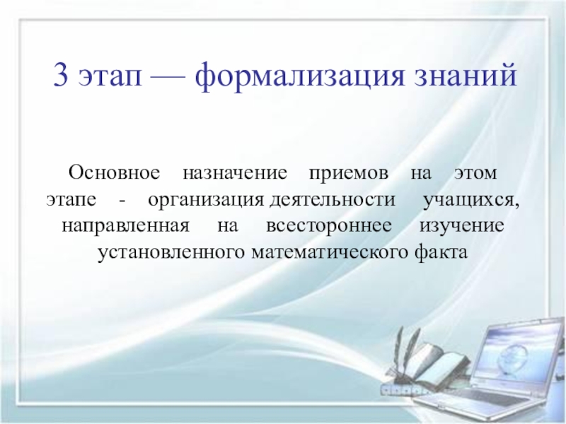 этом этапе - организация деятельности учащихся, направленная на всестороннее изучение установленного математического факта