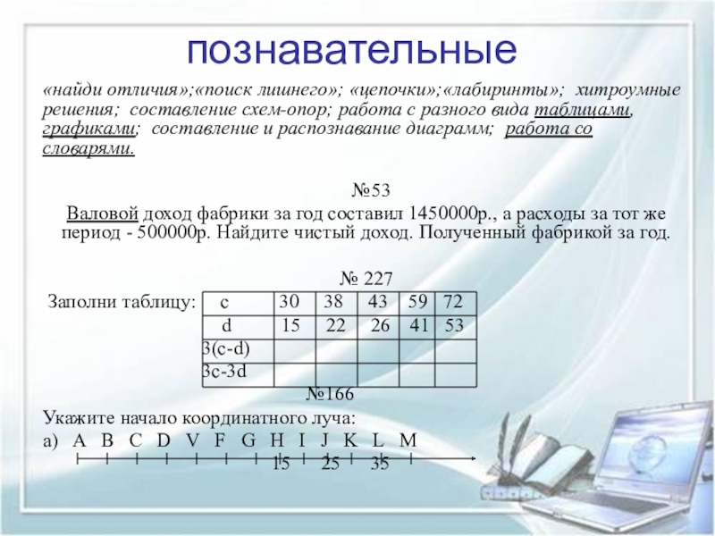 Познавательные: «найди отличия»; «поиск лишнего»; «цепочки»; «лабиринты»; хитроумные решения; составление схем-опор; работа с разного вида таблицами, графиками; составление и распознавание диаграмм; работа со словарями.