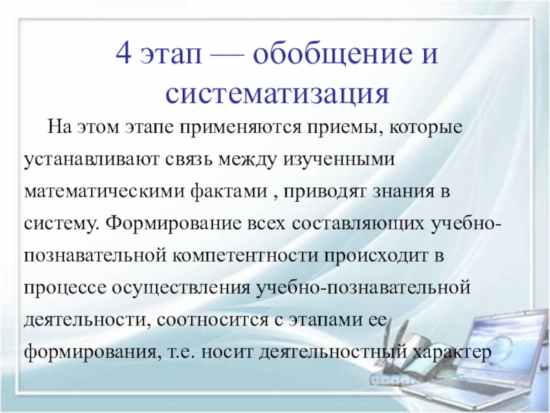 приемы, которые устанавливают связь между изученными математическими фактами , приводят знания в систему. Формирование всех составляющих учебно-познавательной компетентности происходит в процессе осуществления учебно-познавательной деятельности, соотносится с этапами ее формирования, т.е. носит деятельностный характер