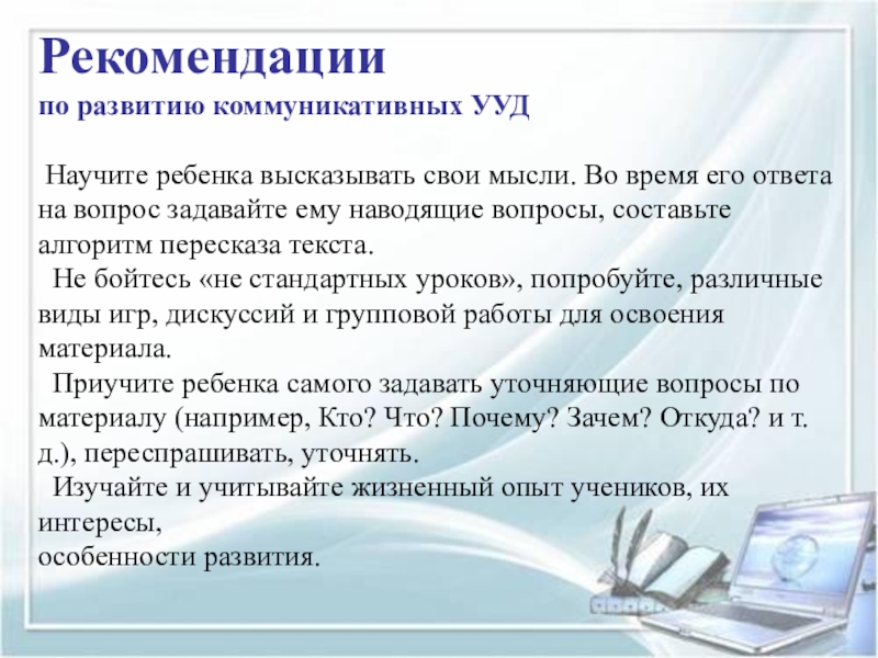 Приучите ребенка самого задавать уточняющие вопросы по материалу (например, Кто? Что? Почему? Зачем? Откуда? и т.д.), переспрашивать, уточнять.