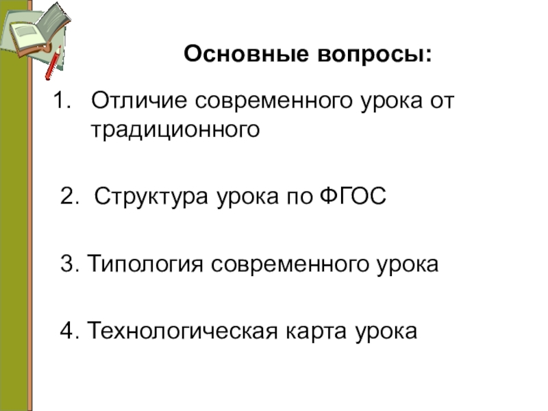 Основные вопросы:Отличие современного урока от традиционного2. Структура урока по ФГОС3. Типология современного урока4. Технологическая карта урока