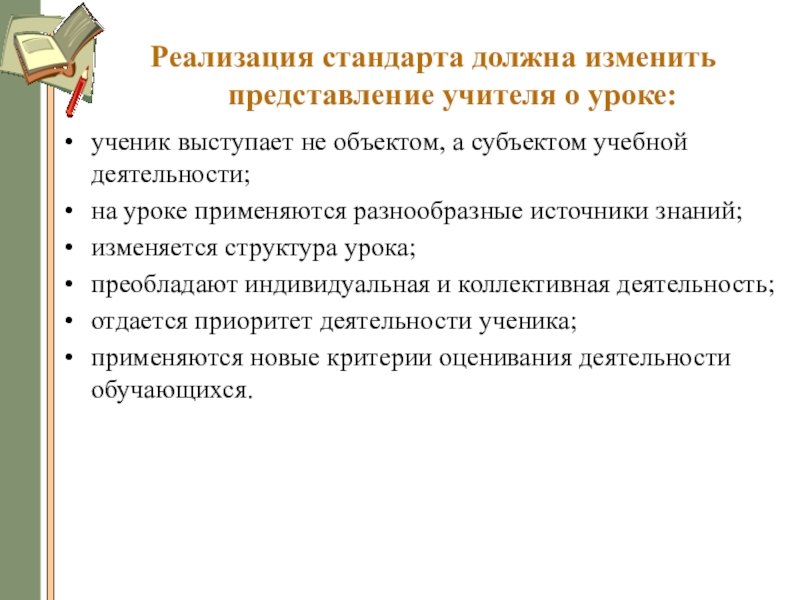 Слайд 11Реализация стандарта должна изменить представление учителя о уроке: