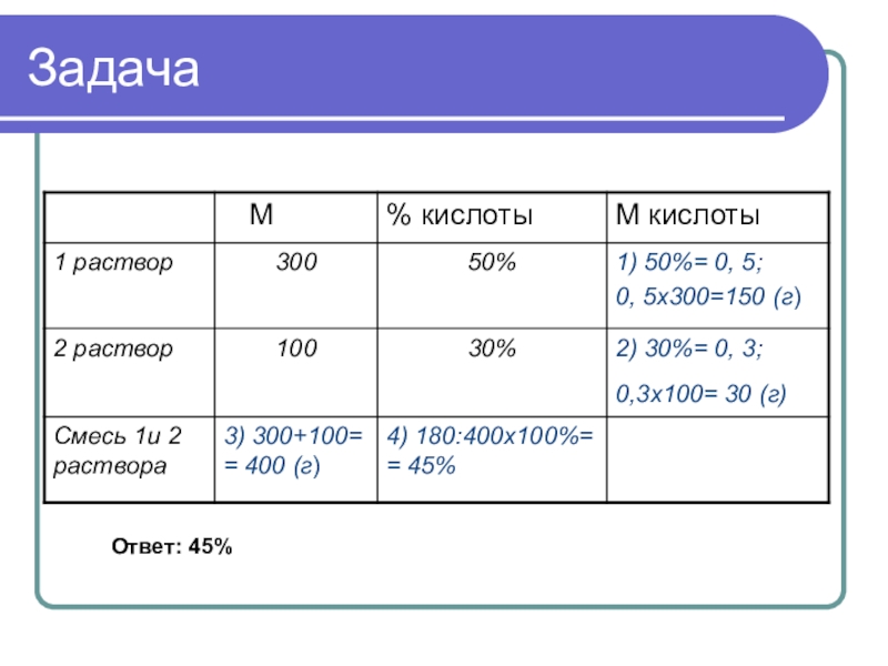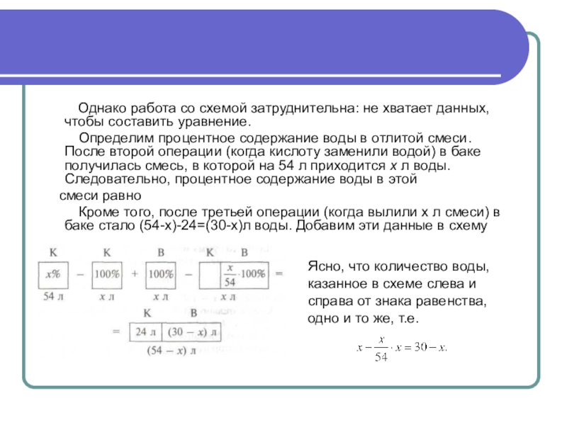 Или, выразив процентное содержание железа в руде и стали:(100 -х)% и 94% соответственно, приравняем массы железа в обоих случаях, получим равносильное уравнение0,01 • (100 - х) • 40 = 0,94 • 20, откуда х = 53.